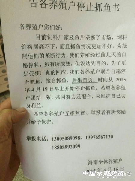 署名为“海南全体养殖户”的《告各养殖户停止抓鱼书》称:“目前饲料厂家及鱼片厂垄断了市场,饲料价格居高不下,而且抓鱼情况更加不好(鱼价越来越低,相比4月6日停料,4月15日的工厂价下滑0.2元/斤)。为了抵制他们的垄断行为,我们养殖经过前几天的自愿停料,虽有所成效,但没达到目的。为了更好促使厂家的回应,我们各养殖户联合自愿停止抓鱼,擅自抓鱼,后果自负。时间从2015年4月19日早上开始停止抓鱼,希望各养殖户团结一致,共同努力及配合,来维护自己切身利益。希望各养殖户互相监督、举报者有所奖励并给予保密。” 回顾整个事件,4月1日海南罗非鱼行业的“双料冠军”海南翔泰渔业股份有限公司(罗非鱼料销量最大和罗非鱼日加工量最大的鱼片厂)向市场发布让利信息后,遭受养殖市场的抵制;4月2日下午,浙江籍的罗非鱼养殖户自发组织联合停料讨论会,计划于4月4日启动停用所有厂家饲料;4月6日正式停料,并自发阻止违反者用料;4月15日再发《告各养殖户停止抓鱼书》。 整个过程,从一开始的口头抵制到通过停料试探,再到直接针对鱼片厂发出“停止出鱼”的信号,可以明显感觉到事态在不断升级。就根源来说,养殖户仅是希望鱼片厂能提高收鱼价格。“现在的饲料成本要3.6元/斤,加上其它的杂费,总共要差不多4.6元/斤。而鱼价是3.9元/斤,你说我们要亏多少?”浙江籍的陈健康是“抵制”事件的全程参与者,他也理解当前不可能让加工厂把价格提至4.6元/斤以上,但其称希望能少亏一点。 而从鱼价走势来看,此前的停料措施效果并不明显,这在一定程度上是因为暖冬加上足量投喂,导致鱼长速加快,因此春节后达上市规格的鱼的比例较高。尽管4月份开始停止喂料,但并不影响规格鱼的上市,起不到调节市场的作用。因此,停料更多的是能降低养殖户的投入。据陈健康介绍,目前的鱼价下,投一包料就相当于要亏30多块钱,不投,则相当于赚了。 但鱼也不能长期不投喂饲料,这是仍存有商品鱼的养殖户最为焦虑的问题。于是,更为直接的方案被提出来——停止出鱼,直接干预市场。此番“猛剂”下来后,未来是否会失控,比如养殖户待价而沽或加工厂因为库存量大而对收鱼意愿不强,仍不得而知。 从旁观者的角度来看,同一个产业链上的两个环节,如果关系成为相互博弈,是件悲哀的事情。毕竟,内乱并不能带来出路。 |