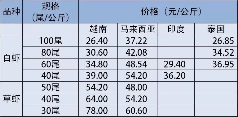 东南亚对虾 印度白虾小涨 虾价分析 上周(2018年3月8日-3月14日),东南亚地区虾价变化不大,印度地区40尾规格的白虾价格略有上涨,目前的价格为36.2元/公斤,60尾规格的价格为29.4元/公斤。越南和马来西亚的价格都在较为稳定的水平。在东南亚地区,印度的白虾价格最有优势,比越南、马来西亚和泰国的都要低。印度也是美国主要的白虾进口国,2018年1月,美国便从印度进口了61593吨白虾,占美国总进口量的33%。 (注:以上产品为当地虾类的塘头收购价,汇率按1越南盾兑换0.0003人民币)