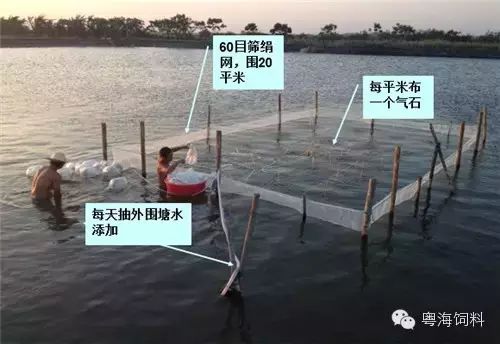 1、直接利用养成池淡化标粗,如果池塘盐度与投苗盐度差距不大,投1cm以上淡化过的苗的,建议在池塘的一角用用40-60目筛绢网围出若干平方米的暂养池,水深50cm左右,每平米布一个气石或布置底氧装置。投苗密度为每平米5000尾,一般标粗7天左右。