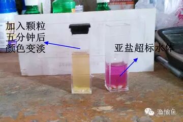 【操作方法】 1、两支检测试管均直接加入超标水体,加入亚盐检测试剂,即可见水体泛红; 2、实验组在加入检测水后,放入3-4颗底质净化颗粒,加入亚盐检测试剂。或者在已经泛红的液体加入底质净化颗粒,经过5分的溶解和反应,即可见亚泛红水体变浅,并向黄色过度。