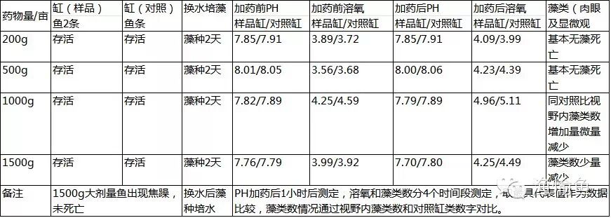 通过实验得出,小剂量对水质PH、溶氧及藻类基本无影响,无法达到杀藻效果。1000g以上大剂量对ph值有降低作用,藻类的生长有一定的抑制作用,藻类只有少量死亡。在大太阳照射下,藻类在中午过后快速生长还原,死亡数量不足为虑。
