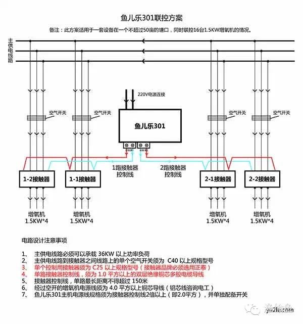 我们以鱼儿乐301型为例,假设增氧机的功率为1.5KW,设计了这样一个,可以联控16台增氧机的电路。